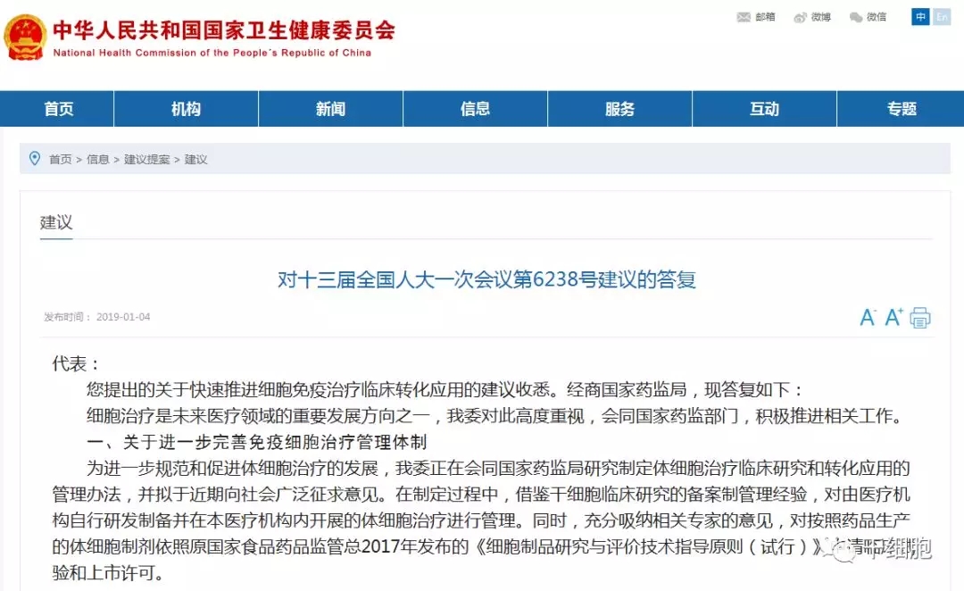 对十三届全国人大一次会议第6238号建议的答复代表: 您提出的关于快速推进细胞免疫治疗临床转化应用的建议收悉。经商国家药监局,现答复如下: 细胞治疗是未来医疗领域的重要发展方向之一,我委对此高度重视,...