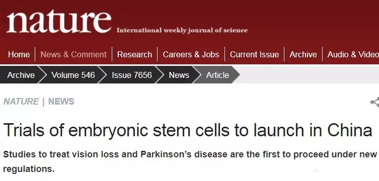 2017年,我国启动了两项利用人胚胎干细胞分化细胞治疗难治性疾病的临床研究,分别为“人胚胎干细胞来源的神经前体细胞治疗帕金森病”以及“人胚胎干细胞来源的视网膜色素上皮细胞治疗干性年龄相关性黄斑变性”。这是我国首批经过卫计委和食药监总局备案的两项基于胚胎干细胞分化细胞的临床研究,也是全球首批基于配型开展的多能干细胞分化细胞临床移植研究项目,受到了国际的广泛关注,Nature News也对此做了客观和详实的报道和评述。